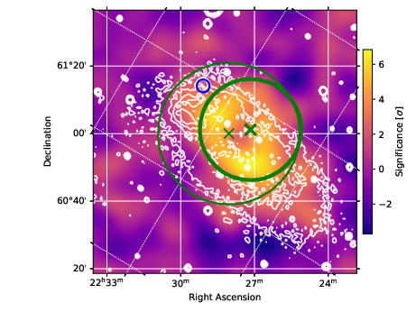 Le petit cercle bleu plein indique la position de J2229+6114. Les cercles verts correspondent aux observations de LHAASO (Yang et al. 2022) : le cercle épais représente les données du WCDA et le cercle fin celles de KM2A ; le centre de l’émission détectée est marqué par une croix (« x »).